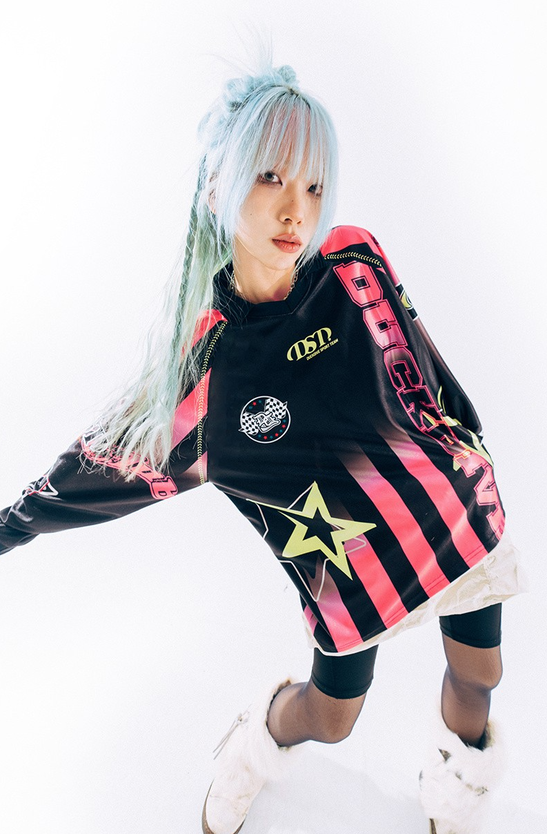 -야구공 스티치와 그래픽으로 포인트가 되는 스포티 무드의 카라 브이넥 롱슬리브