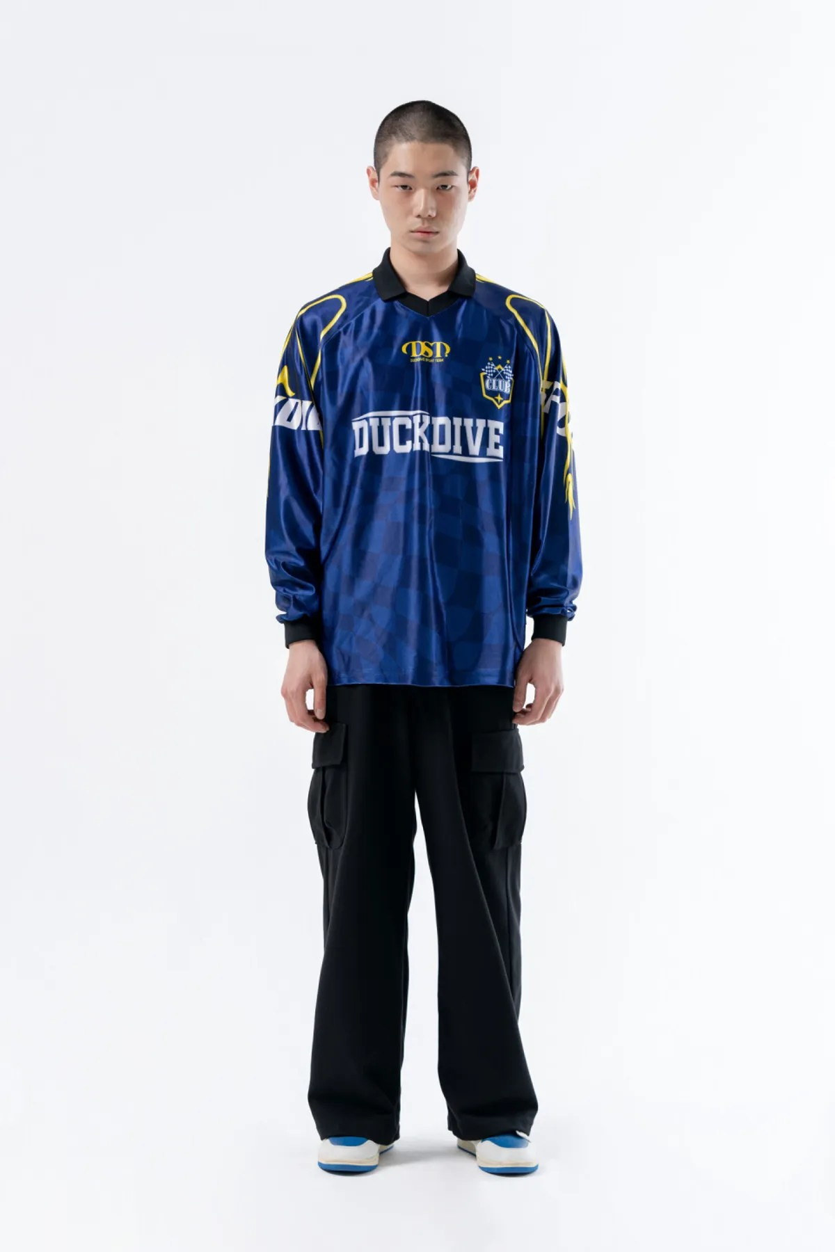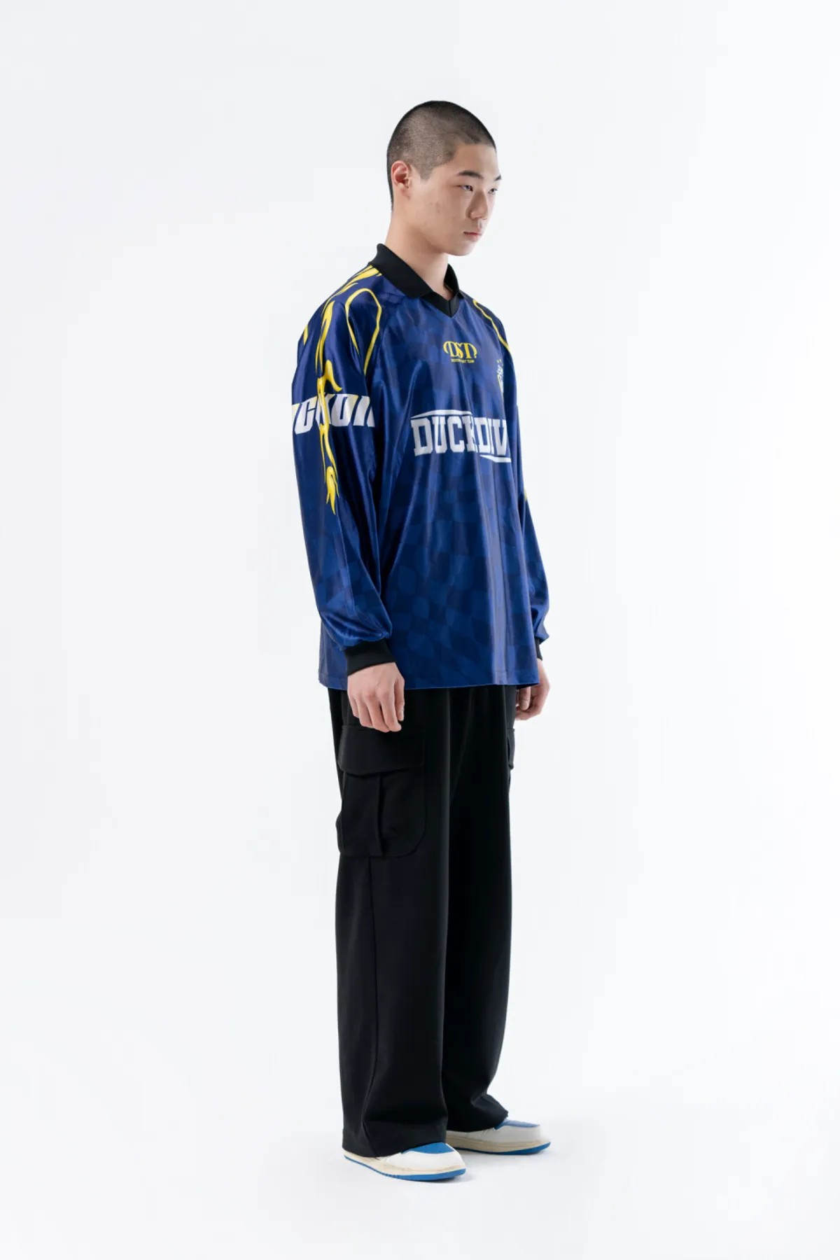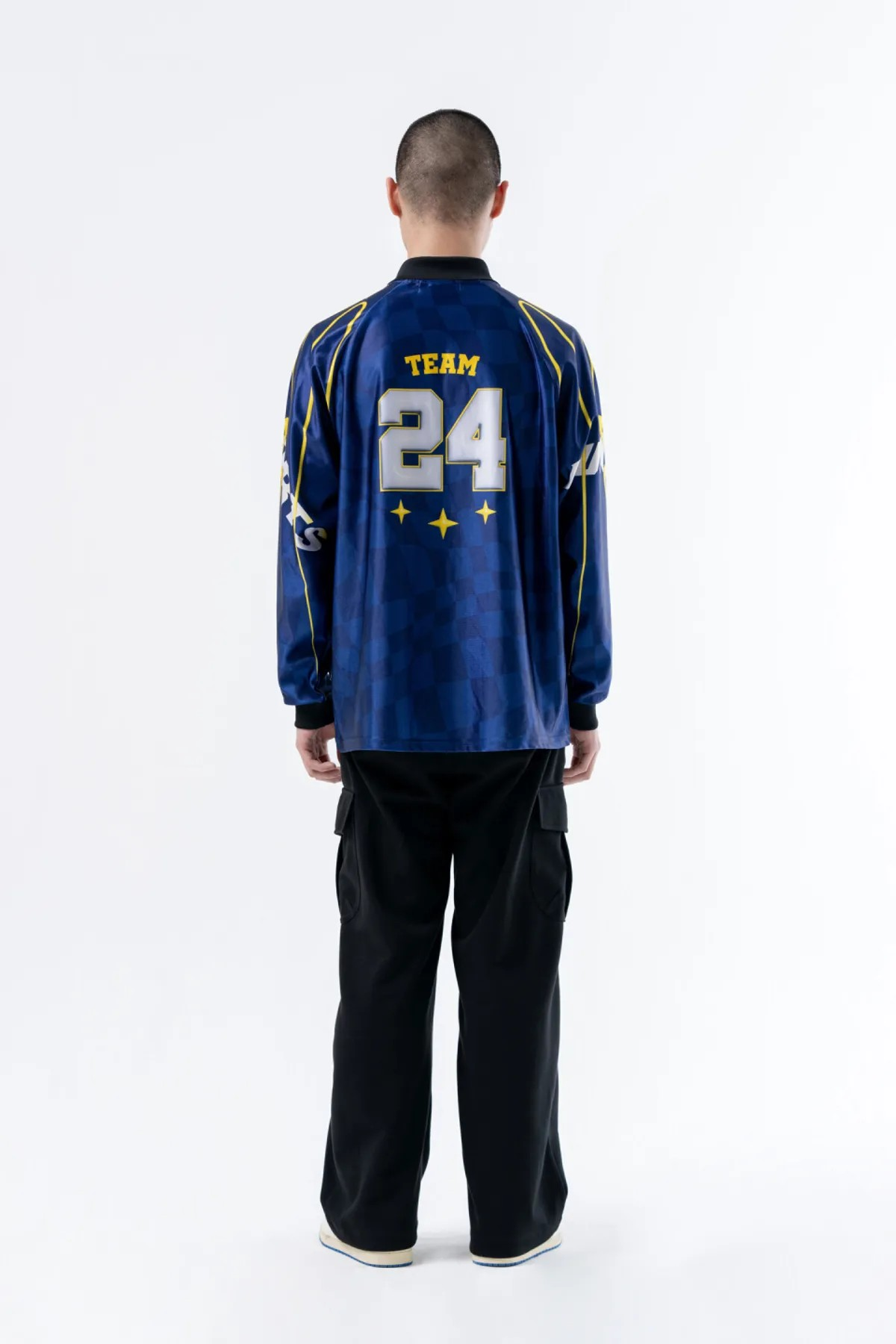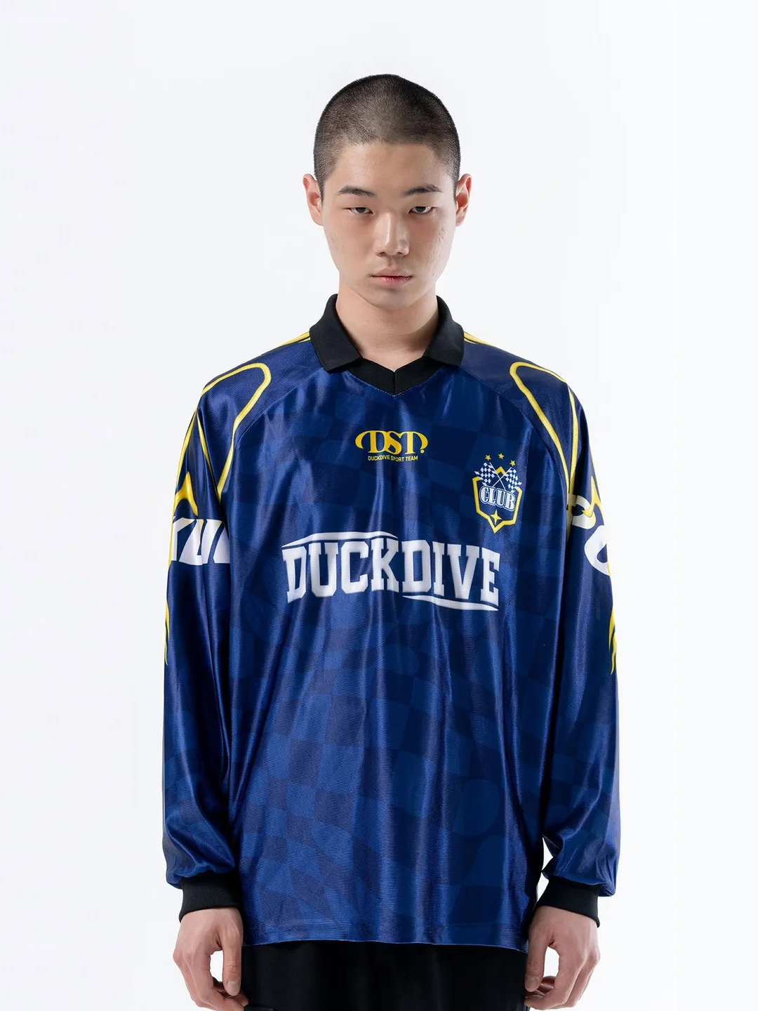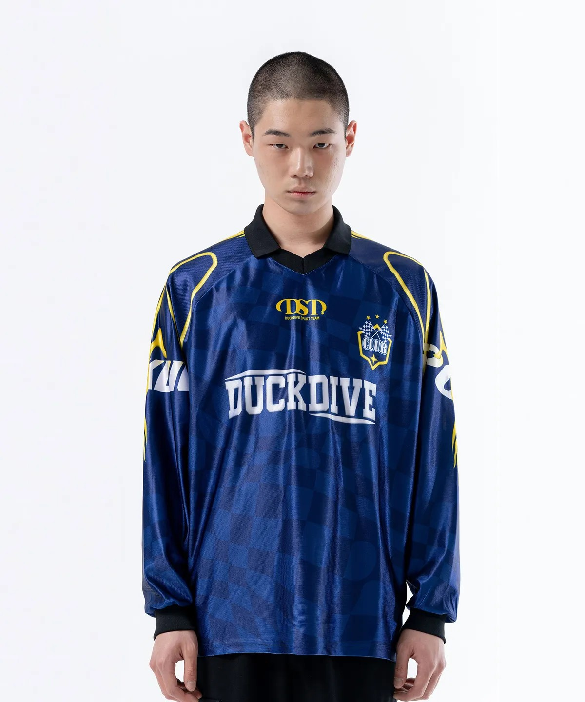 -은은한 체커 그래픽과 스포티 무드 심볼 포인트 카라 브이넥 롱슬리브